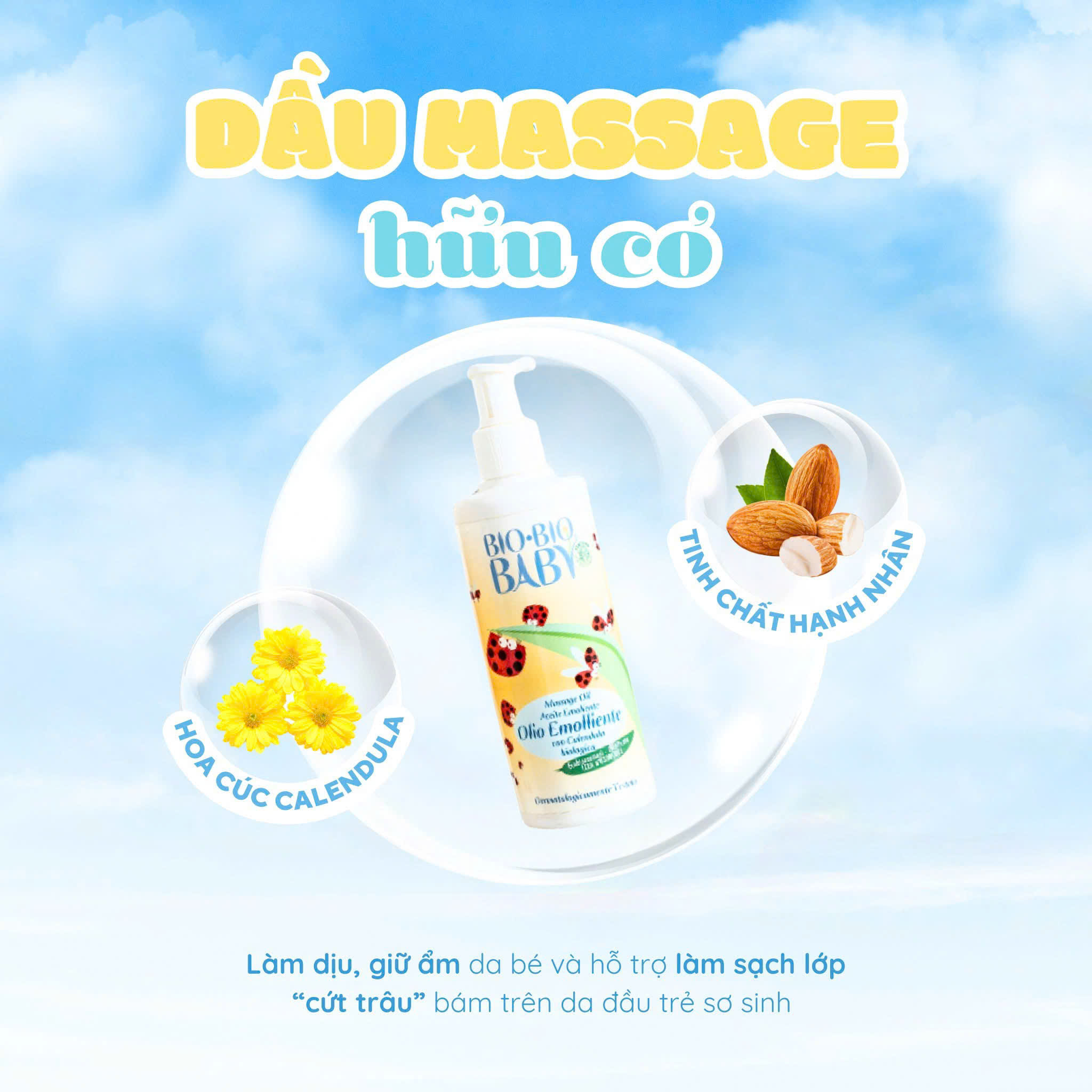- Với hương thơm nhẹ nhàng không gây dị ứng , dầu massage bé Organic Bio Bio Baby là sản phẩm lý tưởng để làm sạch và mát xa cho bé